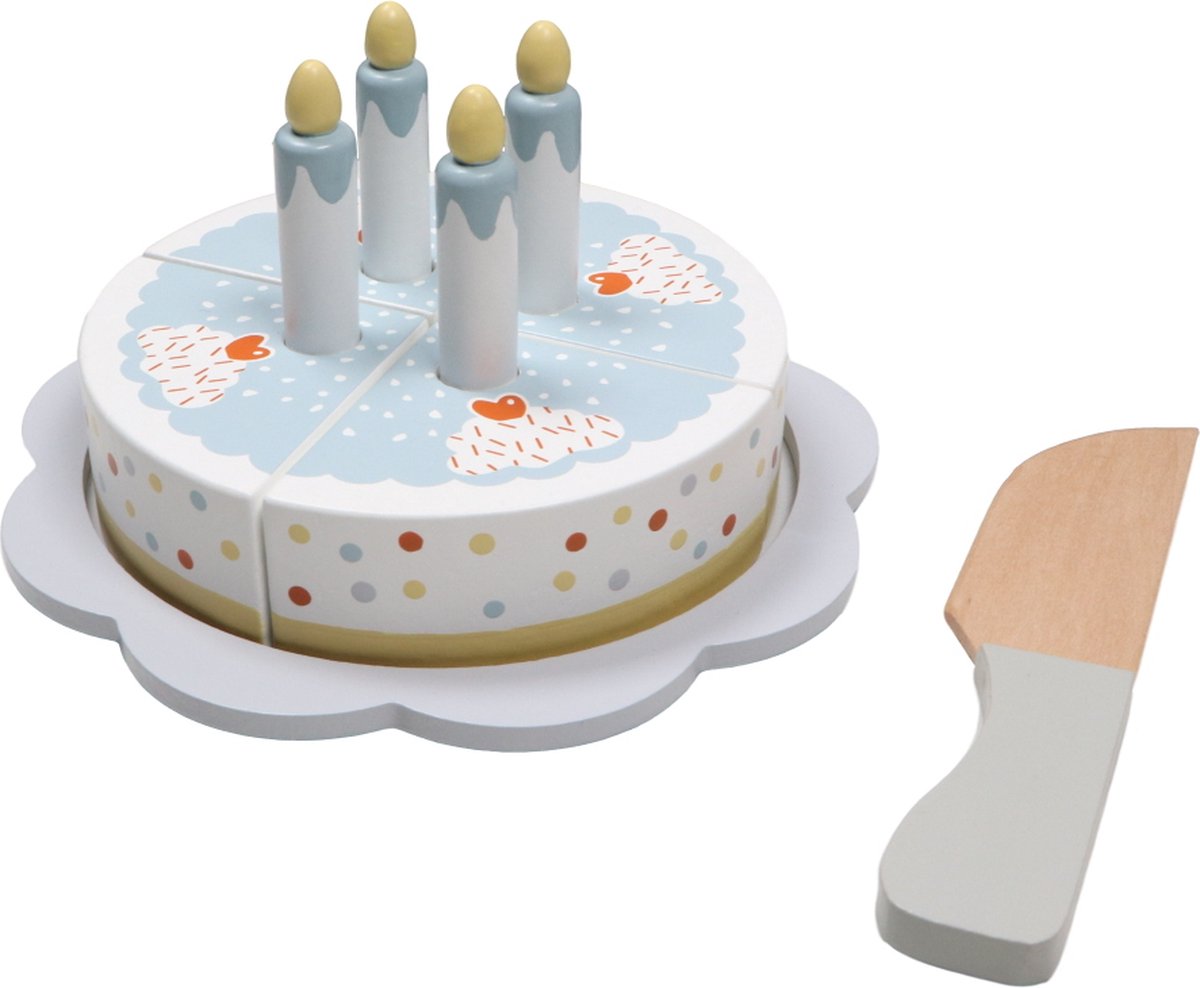 14 delige verjaardagstaart van hout, te verdelen in 5 punten en een taartje bovenop met kaarsje. 18x15x18 cm. Gemaakt van FSC hout met retro pastel tinten voor realistisch, duurzaam, natuurlijk, tijdloos en verantwoord spelen. Adviesleeftijd 3+