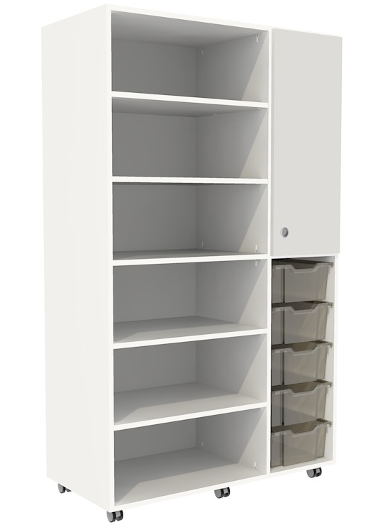 Hoge verrijdbare flex-kast met rechtsbovenin een deur,