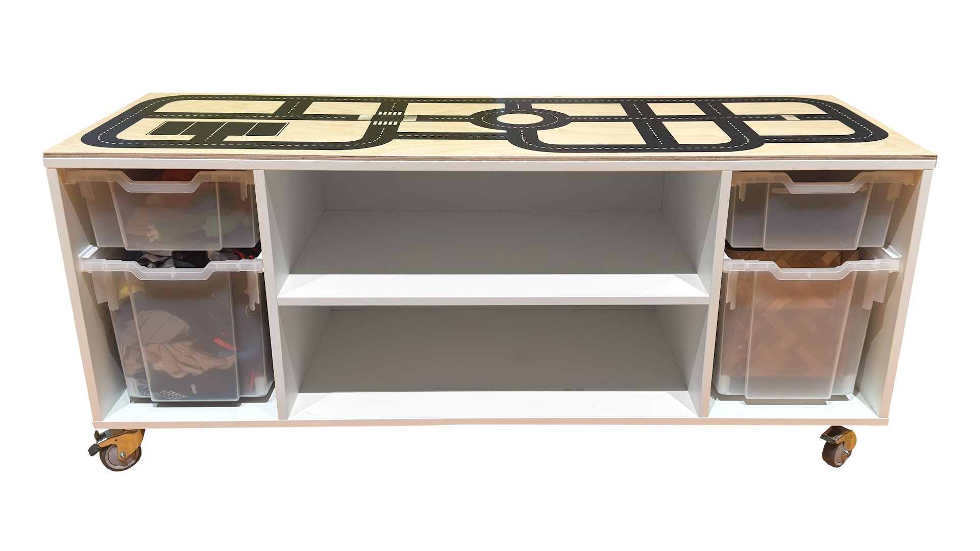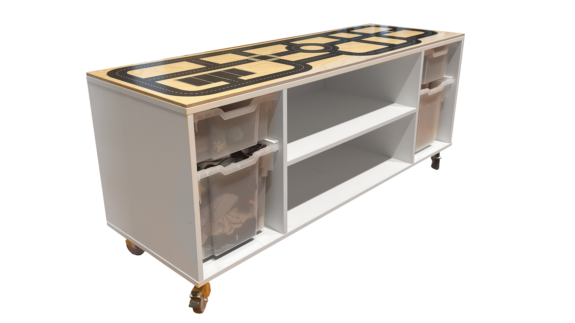 Een prachtige verijdbare bouwkast met autobaan op het bovenblad.