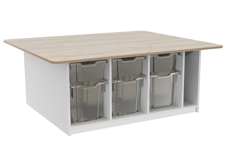 Grote bouwtafel voorzien van 6 grote H30 en 6 mediumgrote H15 transparante lades verdeeld aan beide kanten,