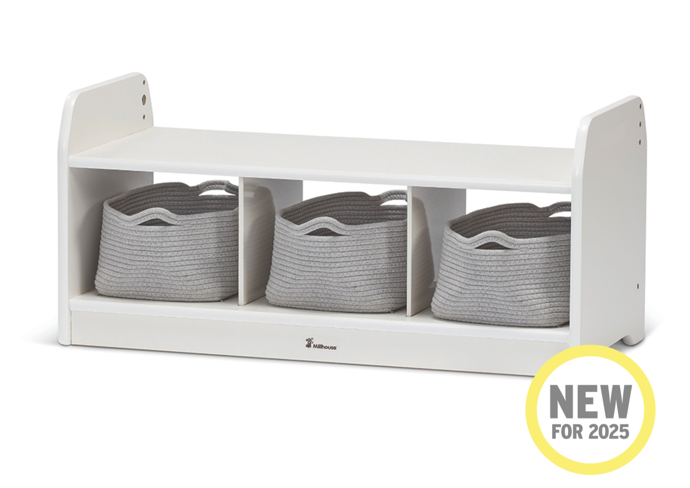 met 3 ondiepe opbergmanden van touw (lichtgrijs).Â