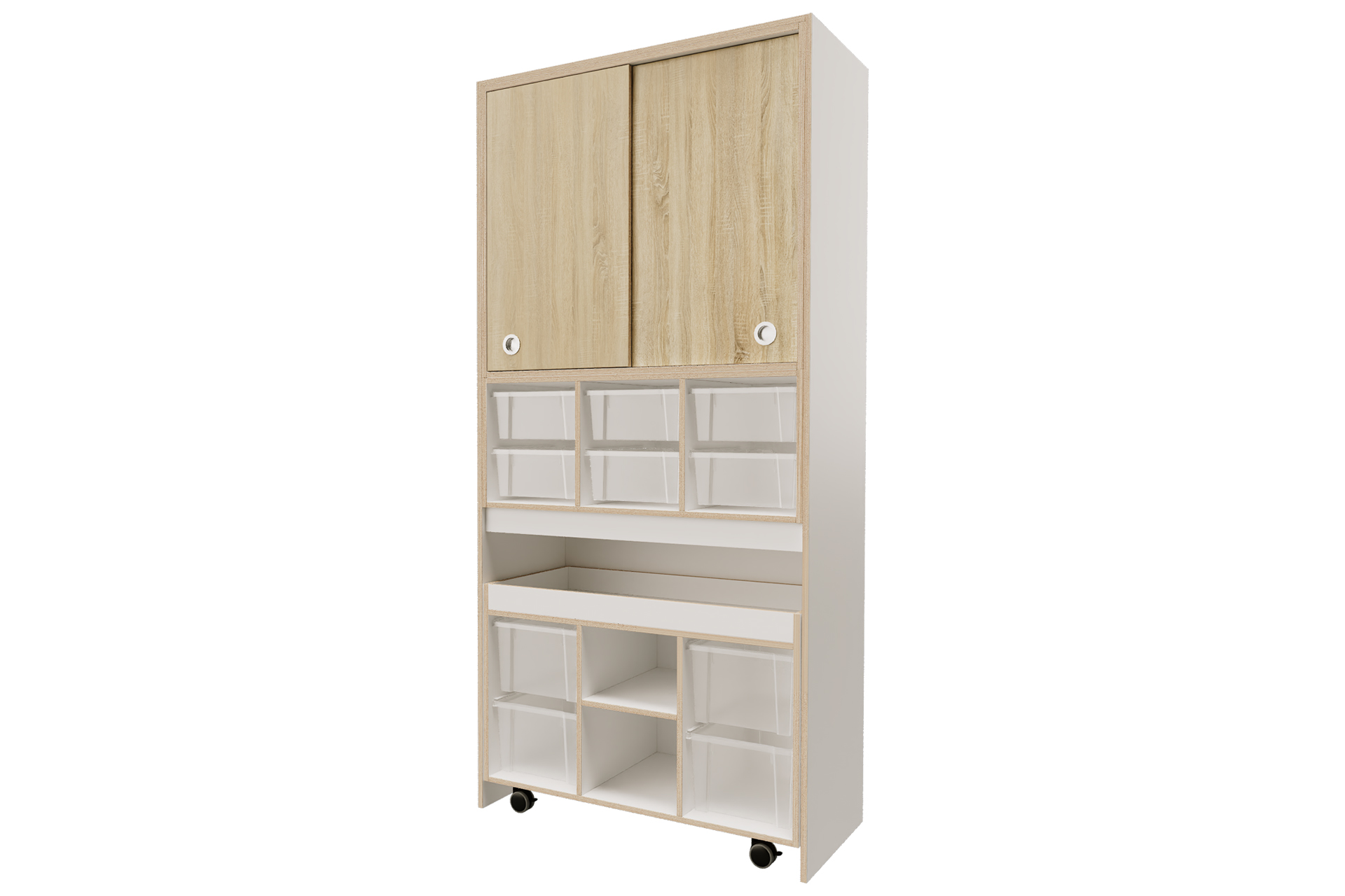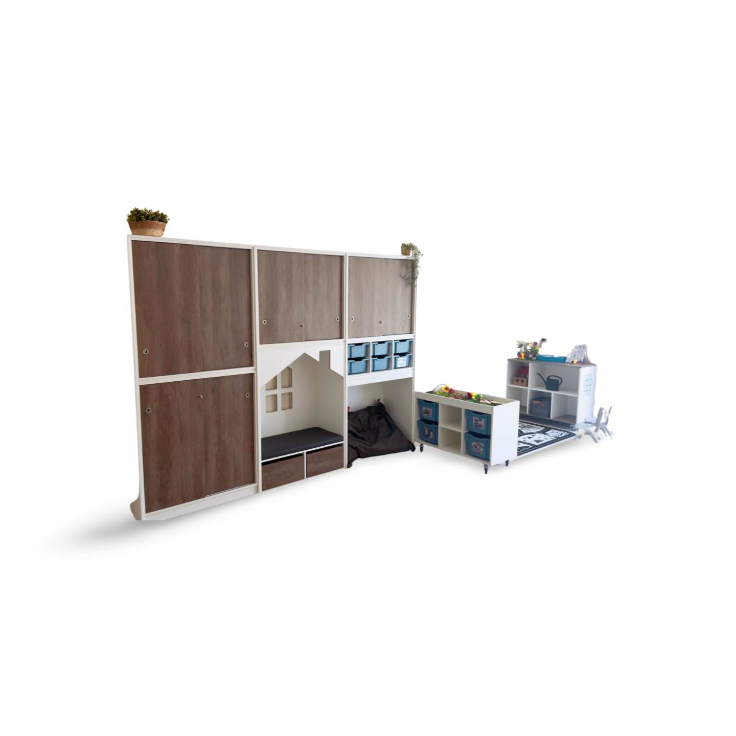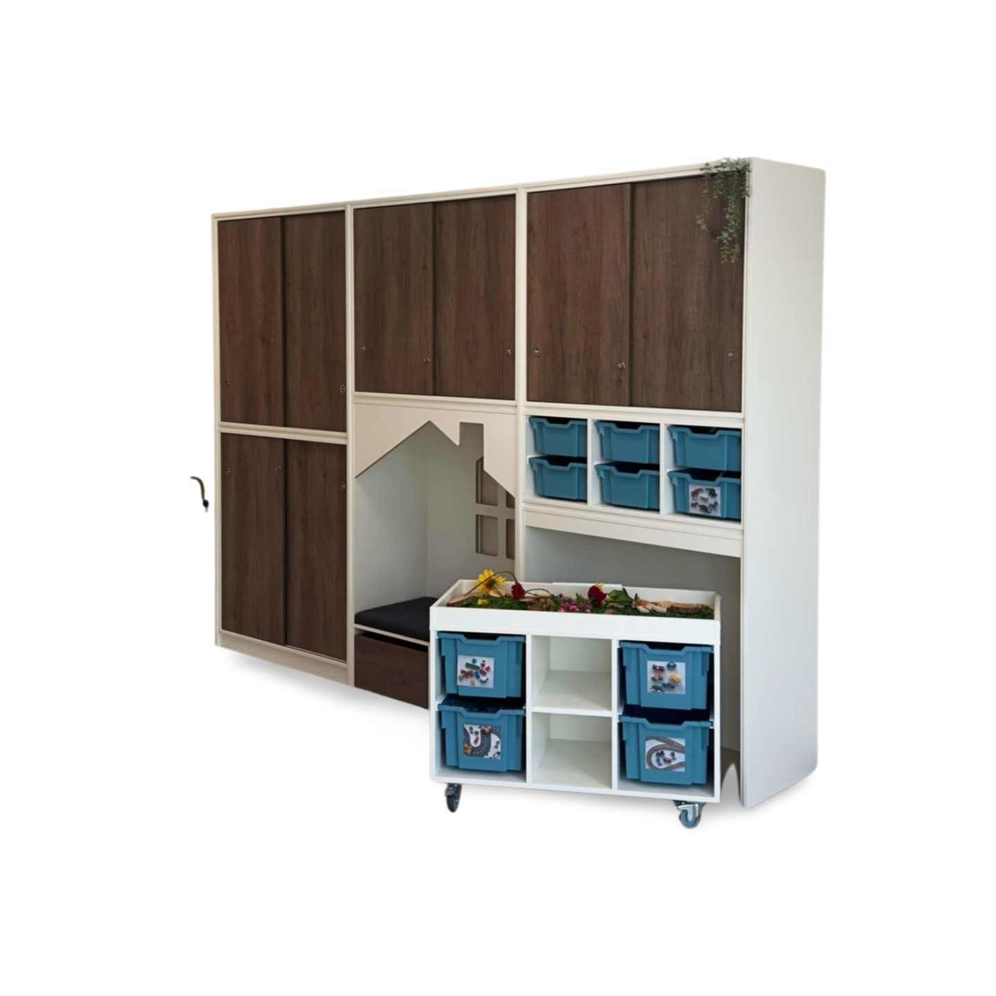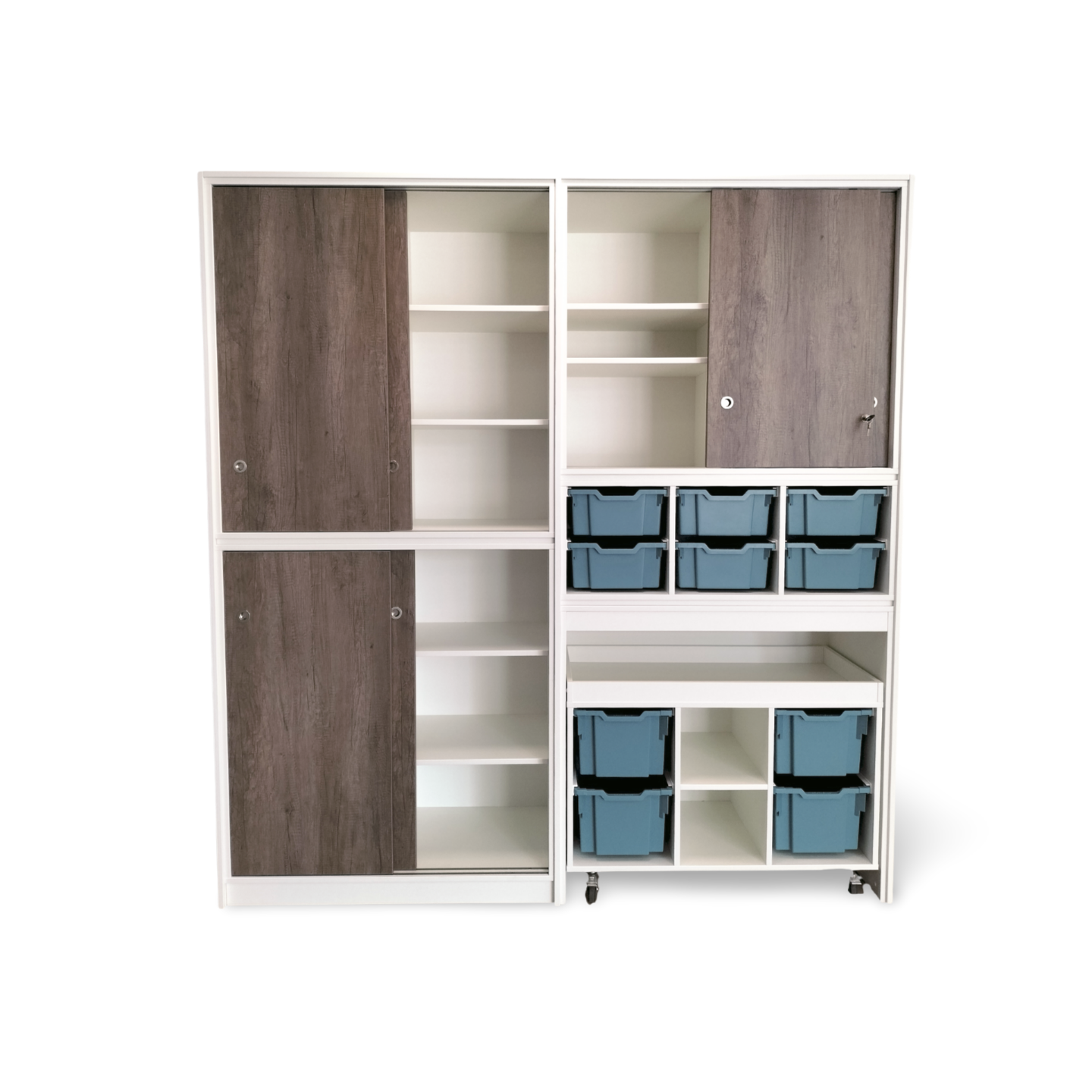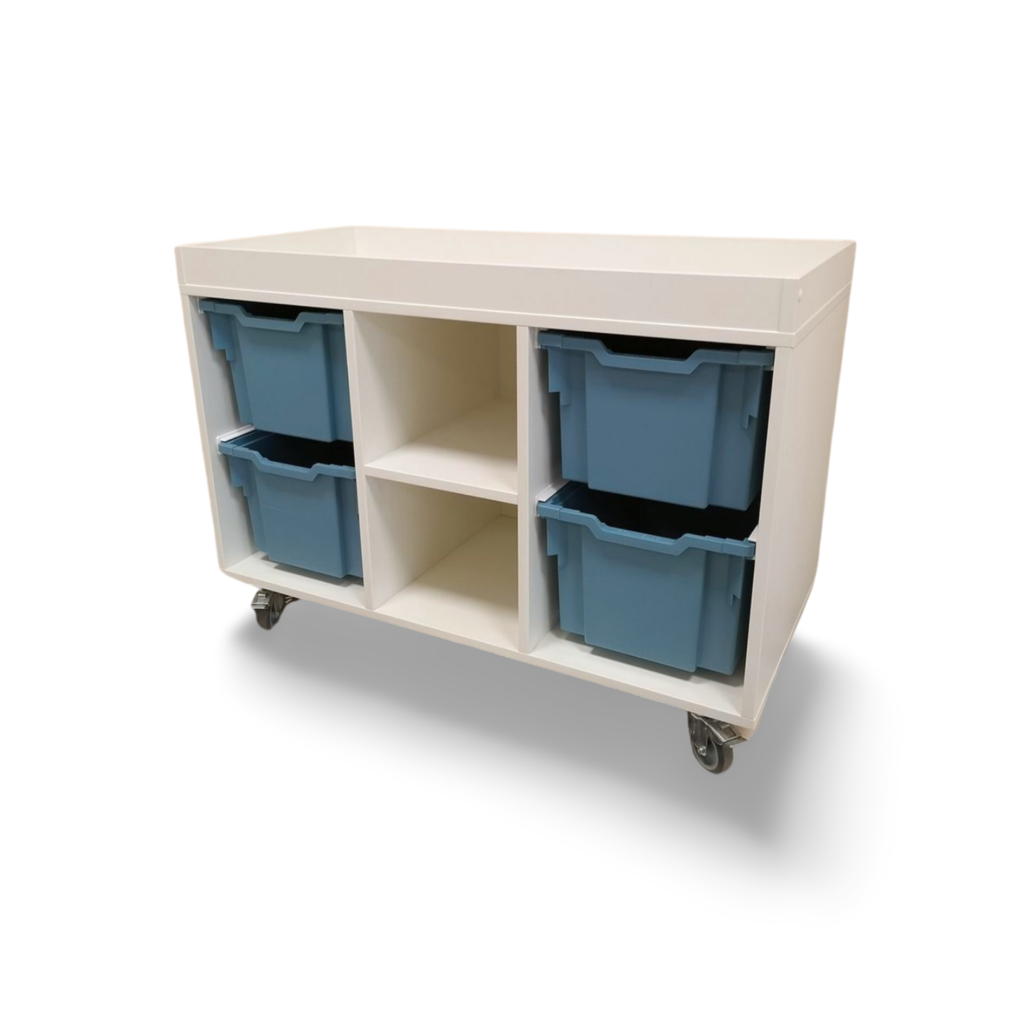 een lage speeltafel inclusief 4 middelhoge Gratnell lades H22.5 in een kleur naar keuze.