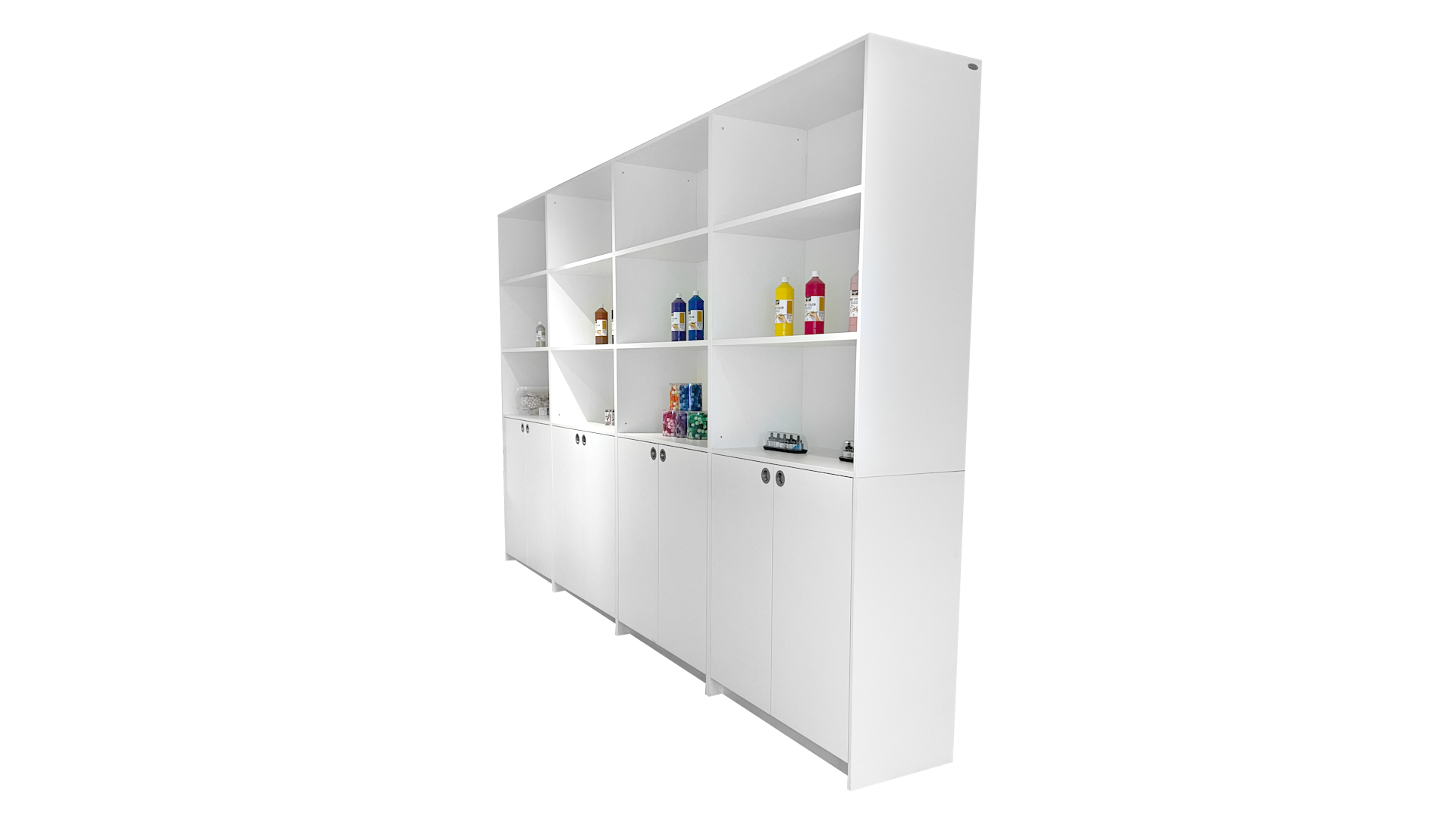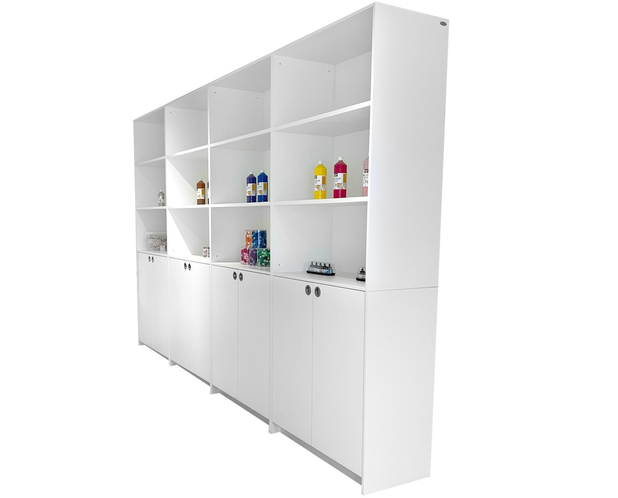 Hoge wandkast met boven 3 grote open vakken en onder 2 draaideuren met legplanken.