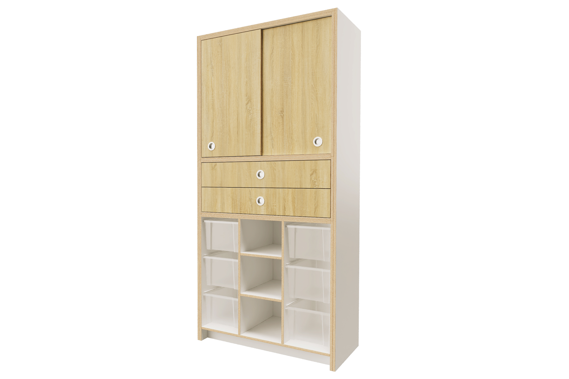 De laden en schuifdeuren zijn leverbaar in een houtdecor naar keuze.Â