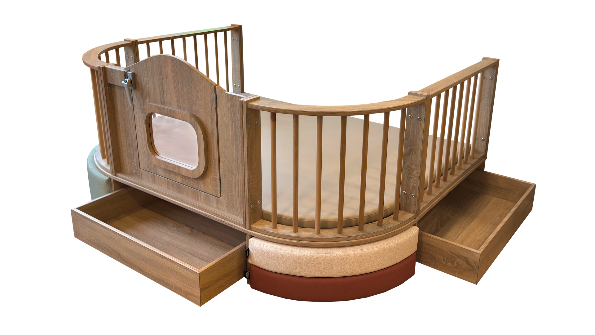 Uitgevoerd met 3 laden met in de hoeken ruimte voor het opberken van speelkussen.