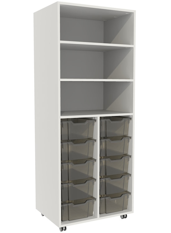 Hoge verrijdbare flex-kast met 3 grote opbergvakken boven en onderin ruimte voor 2 bakmodules onderin.