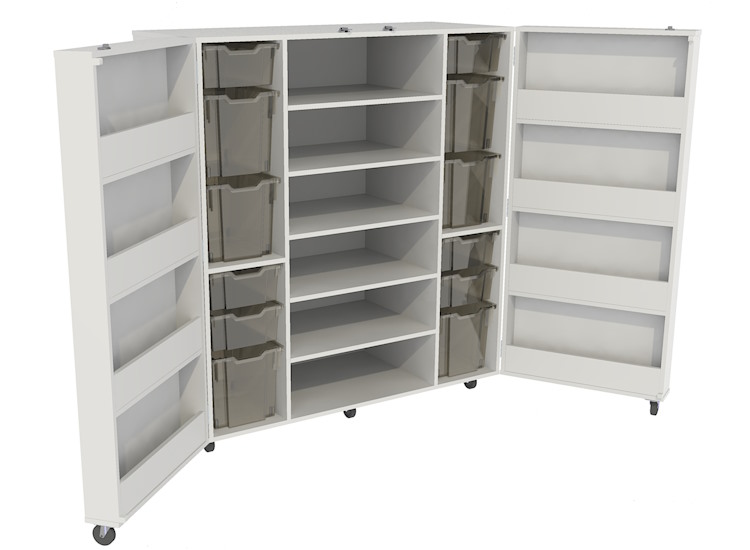 Grote knutselkast volledig wit op geremde wielen met deuren.