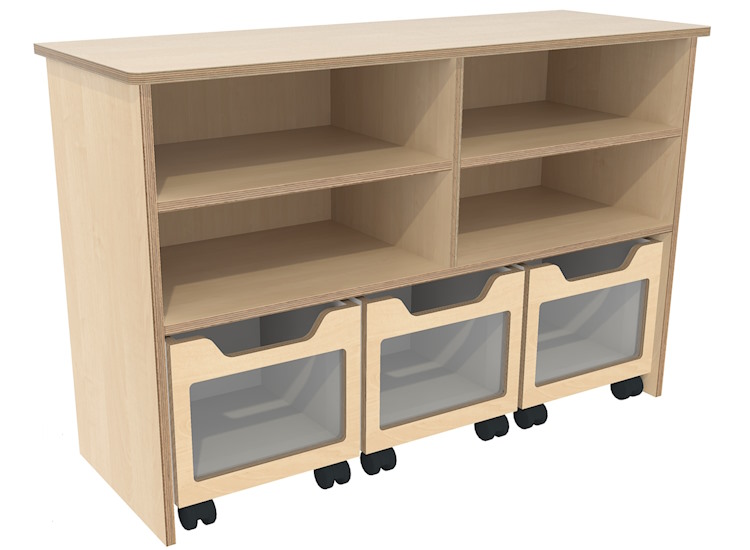 Lage vaste kast met 4 opbergvakken en 3 rolbakken.