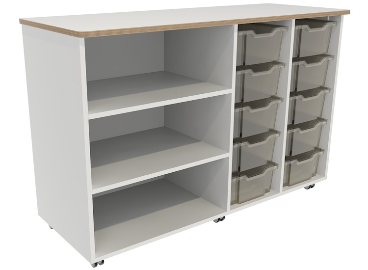 Lage verrijdbare flex-kast met 3 grote opbergvakken links en rechts ruimte voor 2 bakmodules.