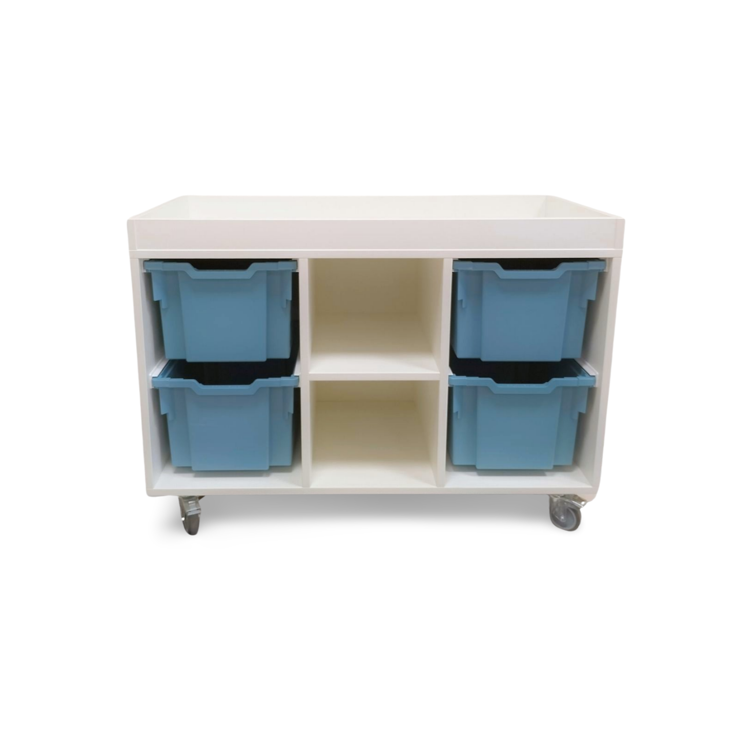 een lage speeltafel inclusief 4 middelhoge Gratnell lades H22.5 in een kleur naar keuze.