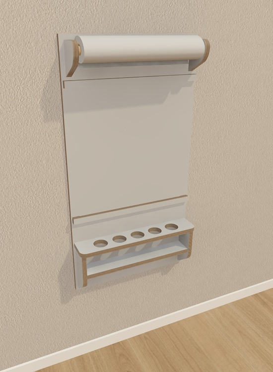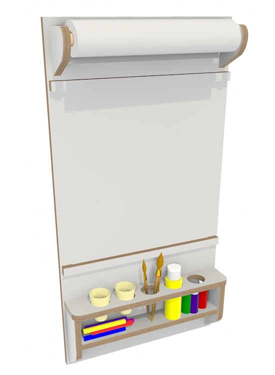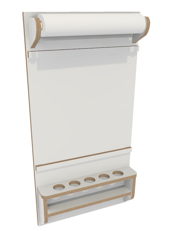 Wandplaat inclusief papierrol en houder voor teken- en schildermateriaal.